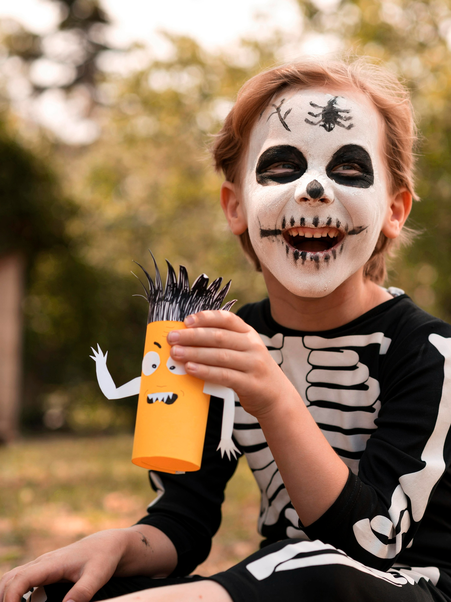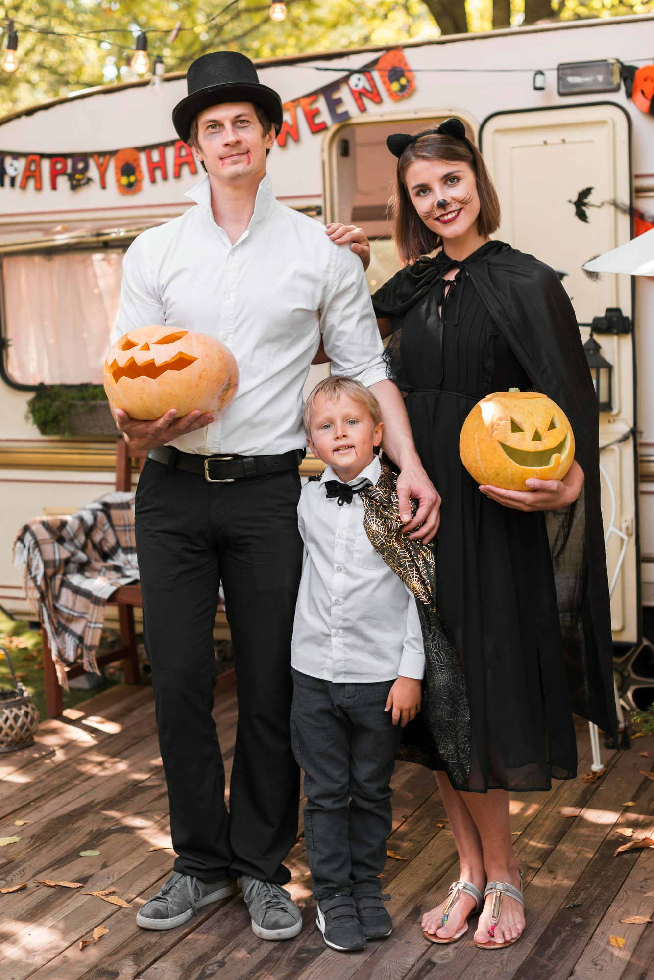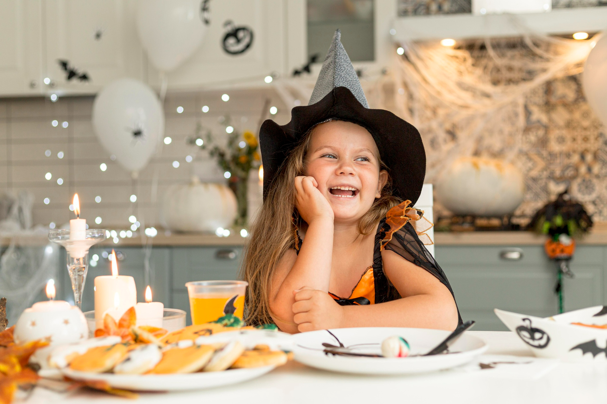 For families and kids, playful setups with pumpkins, candy, and halloween costumes keep the mood lighthearted while still fitting the Halloween spirit.